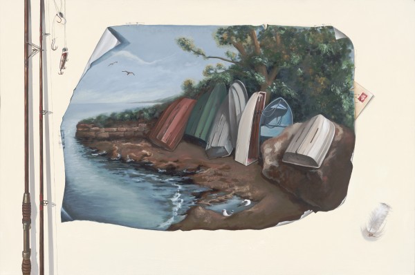 A trompe l’oeil of vintage split cane fishing rods, lures, an aged poster and a letter from Greece!