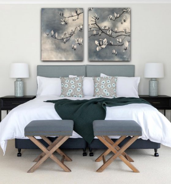 MAGNOLIAS AND FINCHES” Oil on Linen, 2 Panels each 61cm x 76.3cm