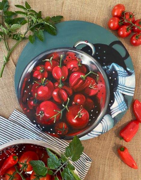 In 2019 we travelled to visit dear friends in the UK. I wandered up to their greenhouse which was flourishing and full of lovely red tomatoes and peppers. I collected them all in a colander with one handle and have treasured that image all this time, waiting to re-create it on canvas. I presented the painting to them during their recent visit to the Highlands.
