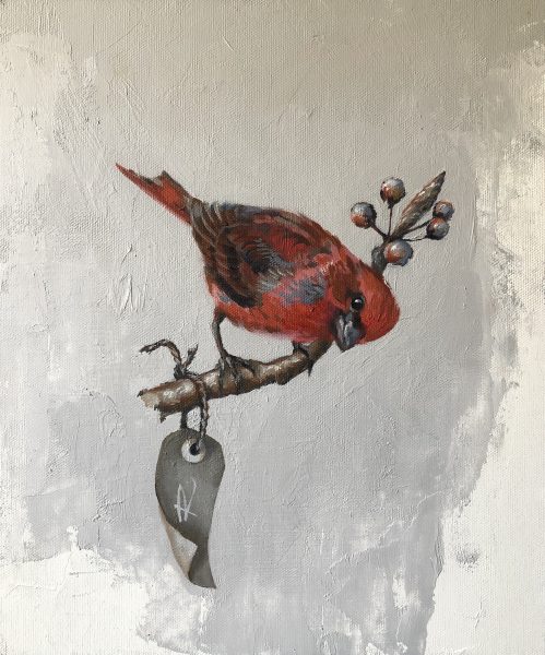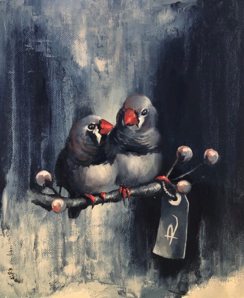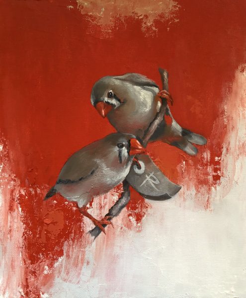 Some of my paintings have already sold but here’s a cute selection of whimsy that I call “One Finch, Two Finch, Red Finch, Blue Finch”. They’ll be on display during the Open Studio Weekend.